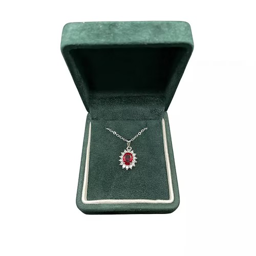 This enchanting white gold necklace showcases a mesmerizing combination of lab-created diamonds and a vibrant red ruby, elegantly arranged in a captivating star design. The focal point of this piece is the oval-shaped red ruby, radiating with intense color and exquisite brilliance, symbolizing passion and vitality.