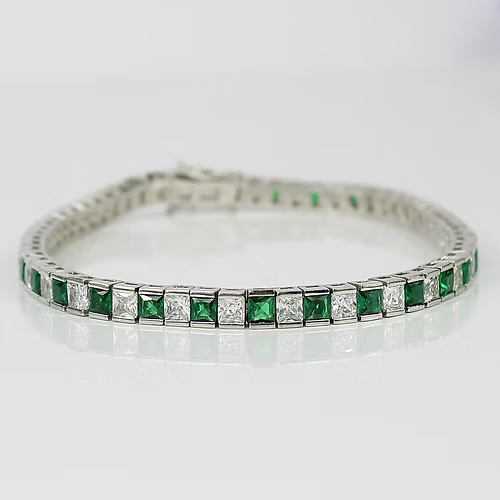 WHITE GOLD FINISH Green Emerald Princess Cut Alternating Created Diamond Bracelet | Birthday, Anniversary, Party, Wedding, Gift
