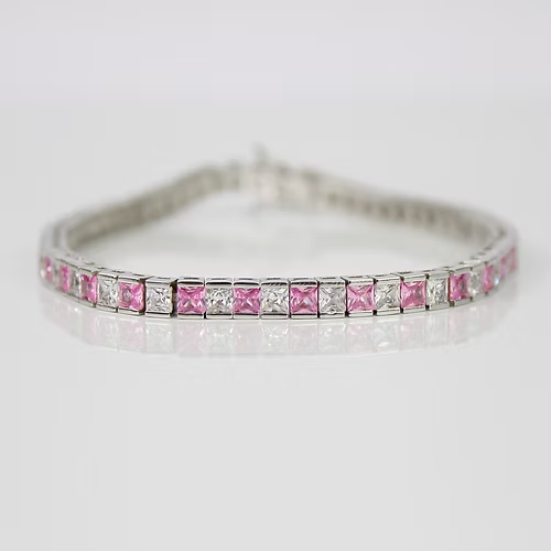 WHITE GOLD FINISH Pink Tourmaline Princess Cut Alternating Created Diamond Bracelet | Wedding, Engagement, Birthday, Party, Gift