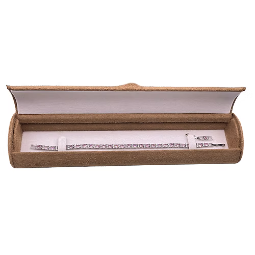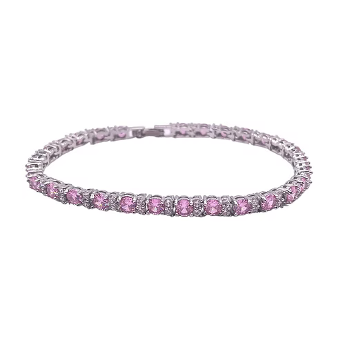 This pink tourmaline and created diamond bracelet is made in the style of a tennis bracelet with a circular fine finish, with created pink tourmaline gems. It is a bracelet sure to provide you with style comfort. The pink tourmaline gems are studded with small diamanté's carved to perfection, offering a great sheen and pristine look.
