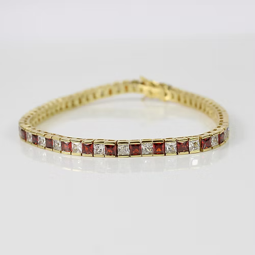 YELLOW GOLD FINISH Red Garnet Princess Cut Alternating Created Diamond Bracelet | Wedding, Engagement, Anniversary, Birthday, Party, Gift